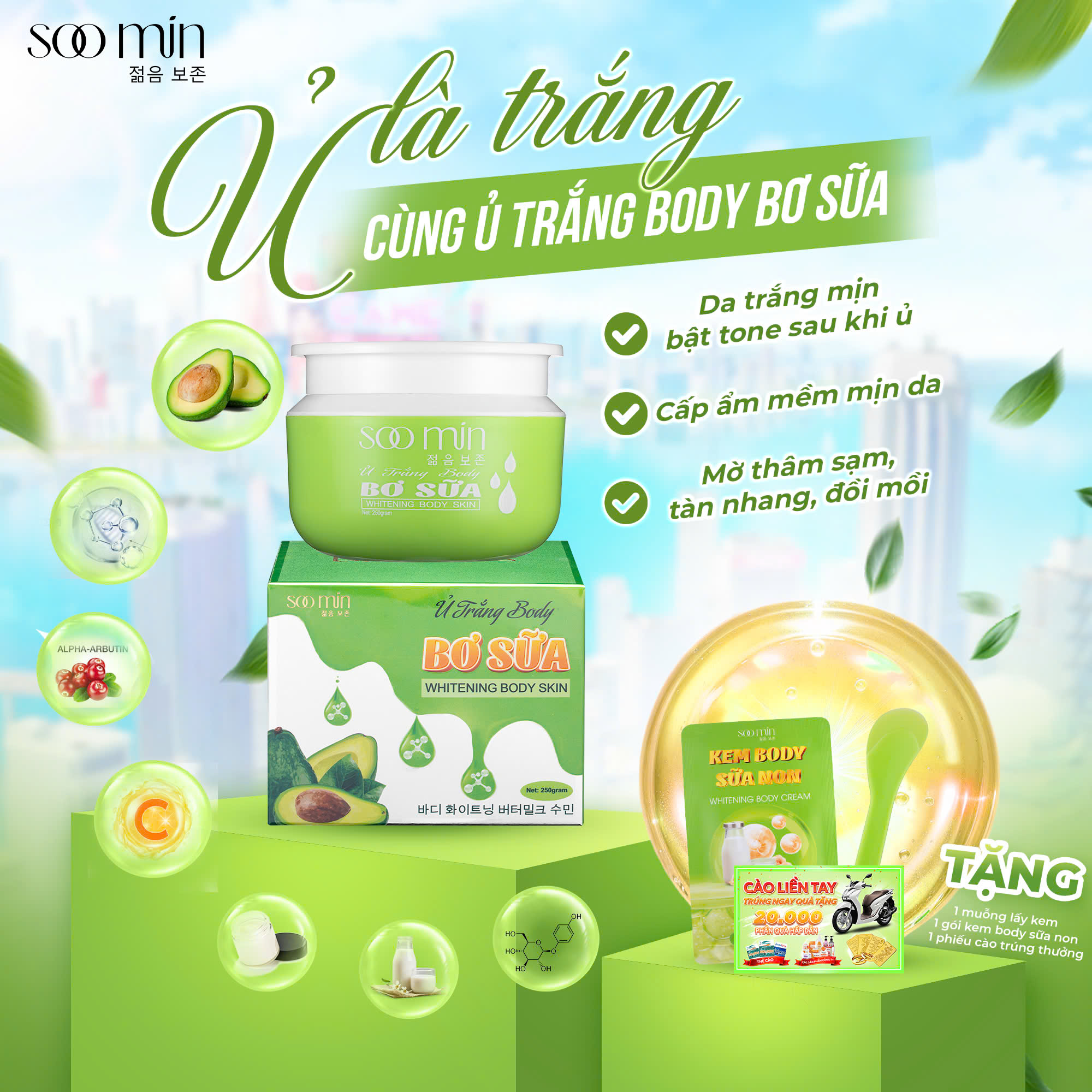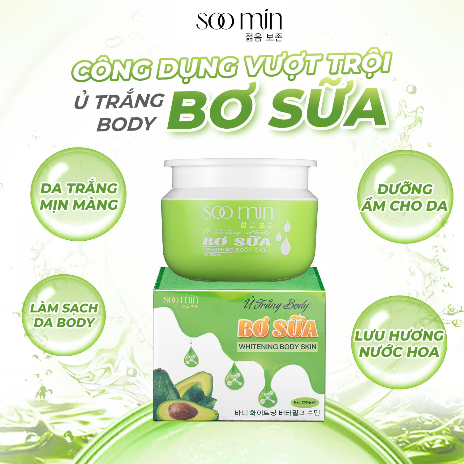 Ủ trắng body bơ sữa soo min một dòng ủ trắng được yêu thích nhất và sử dụng rộng rãi nhất hiện nay. Giúp hỗ trợ da sáng mịn đều màu. Ủ tuần 1-2 lần nhé.